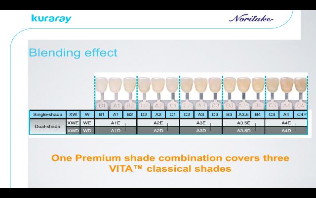 Η ολοκαίνουργια σύνθετη ρητίνη της Kuraray Noritake είναι επαναστατική. Ο οδοντίατρος μπορεί να καλύψει τρεις κλασικές αποχρώσεις της VITA μόνο μ’ένα συνδυασμό αποχρώσεων της Premium. Τώρα έχετε καταπληκτικό αποτέλεσμα με λιγότερες αποχρώσεις. Σύμφωνα με την εταιρεία και τους οδοντιάτρους που ελέγχουν το προϊόν, το όριο της αδαμαντίνης με την αποκατάσταση απλώς έχει εξαφανιστεί.